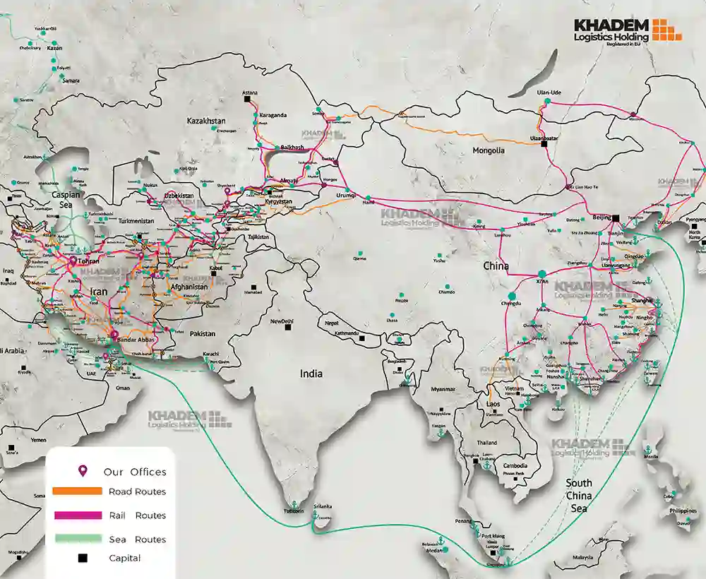 شرکت خادم لجستیک به عنوان یک حمل و نقل بینالمللی، از این شبکه حملی بزرگ بهرهبرداری میکند و خدمات حمل و نقل بینالمللی را با بهرهگیری از تسهیلات و امکانات این شبکه، به مشتریان خود ارائه میدهد. شرکت خادم لجستیک با توجه به اهمیت و جایگاه چین و قدرت اقتصادی این کشور ، از راههای مختلف حمل و نقل از جمله حمل دریایی،ریلی و هوایی برای محمولات استفاده میکند.